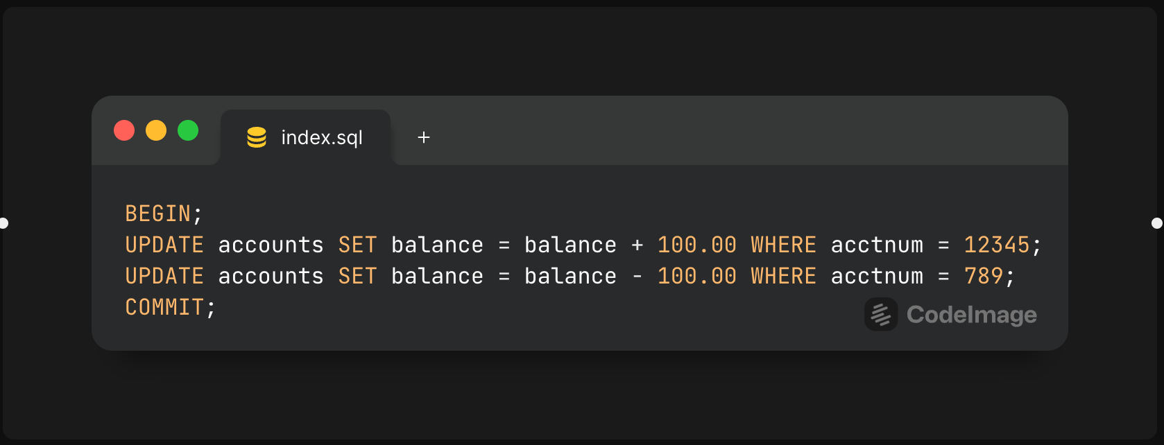 针对这个案例,我们肯定希望两个更新要么同时发生,要么都不发生。这就是原子性所保证的——``` 整个事务要么作为一个单元成功,要么作为一个单元失败。```
