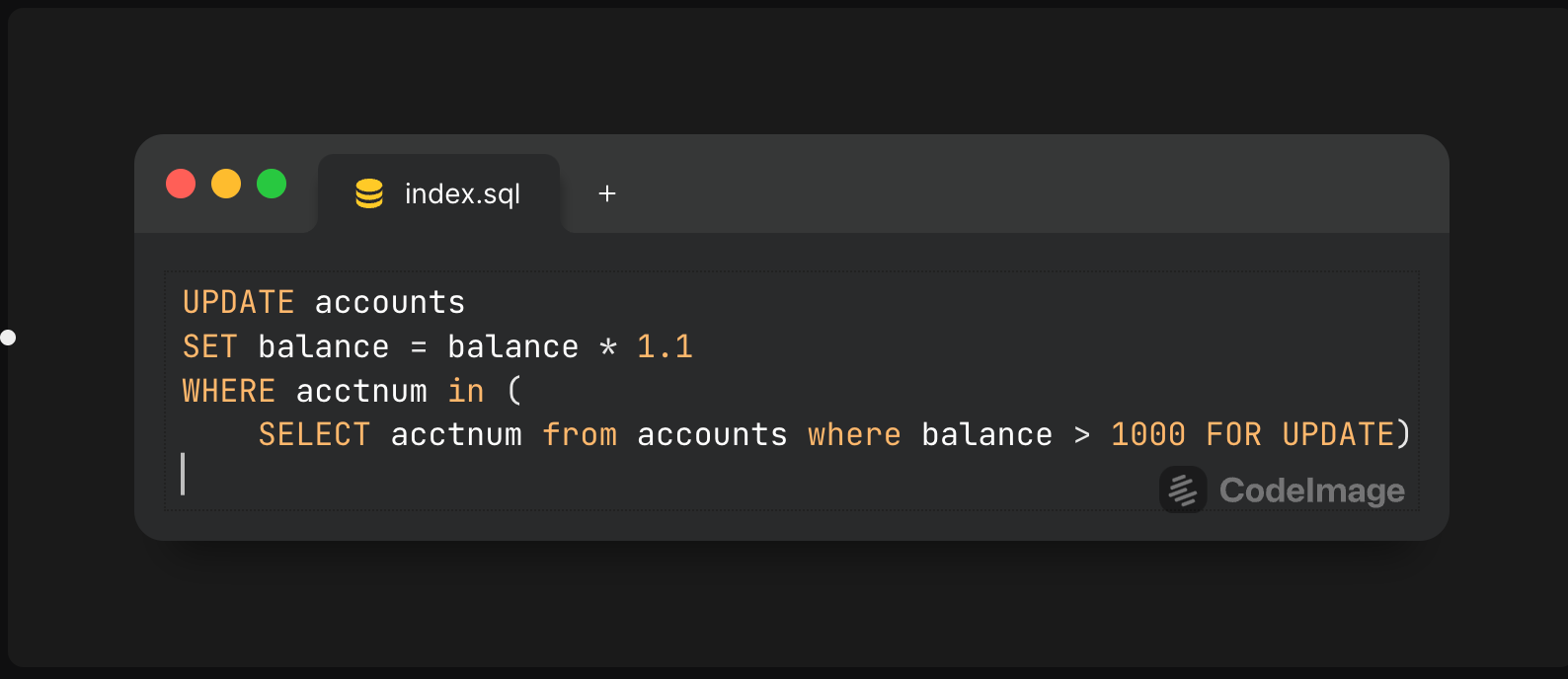 **SELECT…FOR UPDATE** 锁定了它选择的那些行。在这个例子中,其他会话在更新进行时将无法更新任何账户中的余额,从而防止了数据不一致性。当然,在这一点上,你需要权衡锁带来的性能影响与使用更高隔离级别带来的影响。