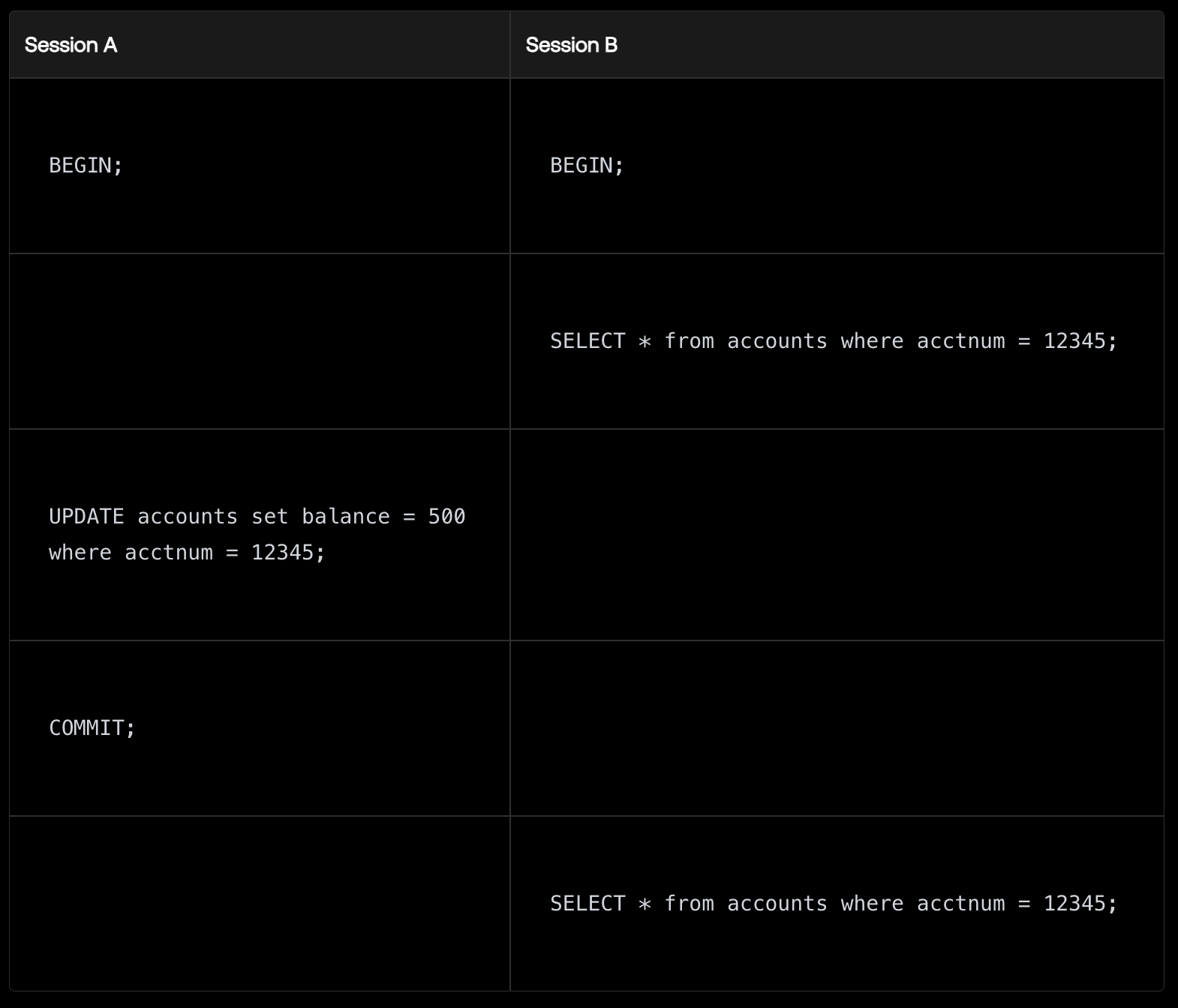 在“已提交读”隔离级别下,会话B中事务的第一次查询将返回与第二次查询不同的结果,因为会话A中的事务在两次查询之间已经提交了。从它们反映了数据库持久状态的角度来看,这两个结果都是“正确”的,但它们是不同的。你可能会思考,“这为什么会成为问题呢”?