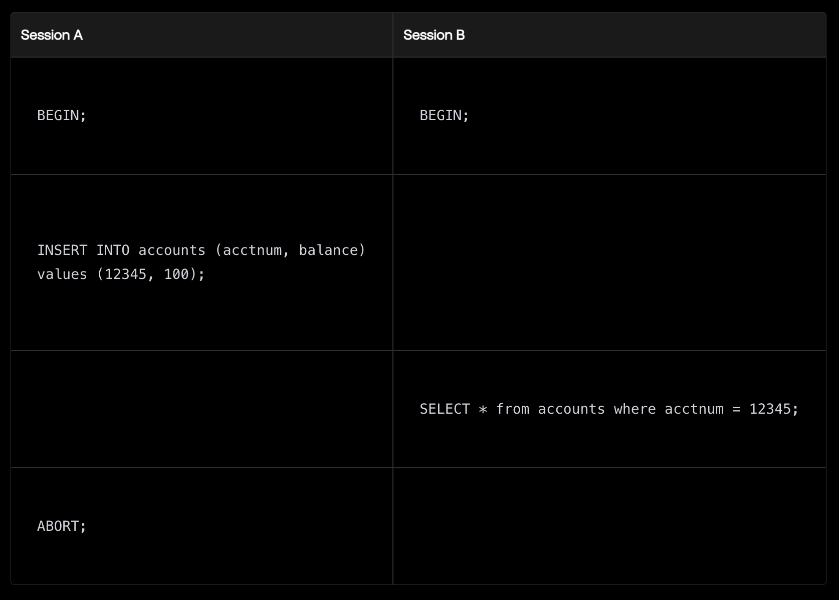 在“Read Uncommitted” 隔离级别下,如果这两个会话并发执行,会话B将看到一个不存在的账户和一个不存在的余额,最终导致业务错误。