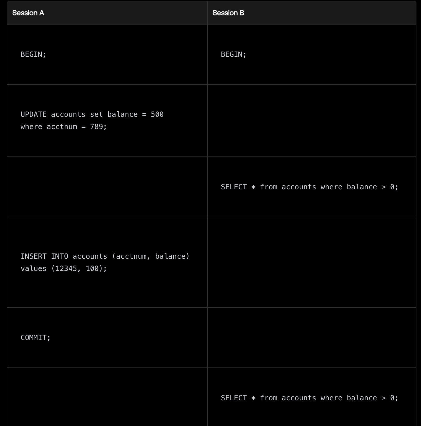 在“可重复读”隔离级别下,会话B中的两次查询将显示账户789的相同余额。因为在会话A中所做的更新对会话B来说是不可见的。然而,第二次查询也会包含由会话A创建的账户12345。这就是一个新行突然在事务中间出现。