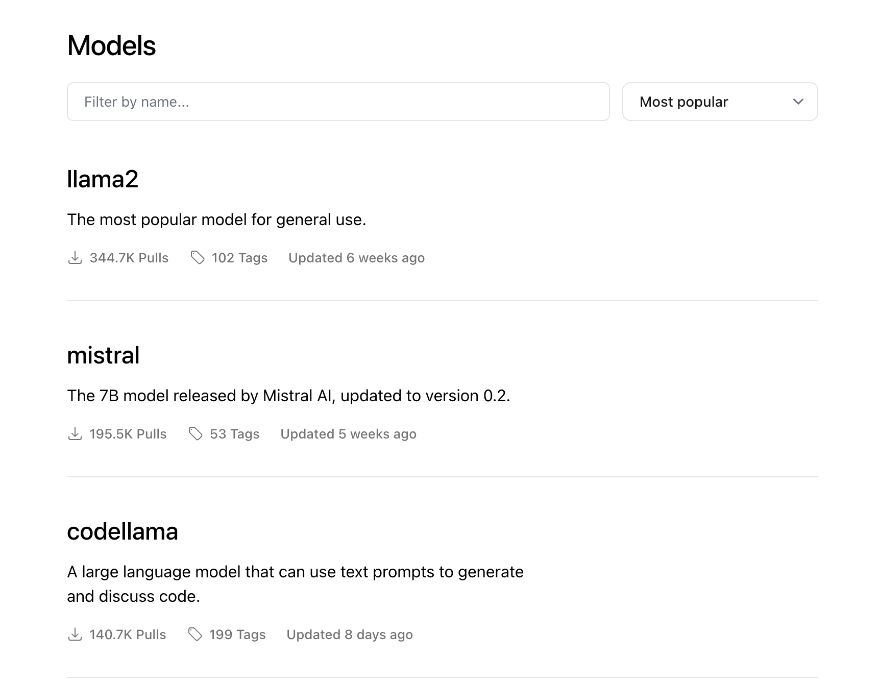 支持很多非常流行的LLM,https://ollama.ai/library?sort=popular